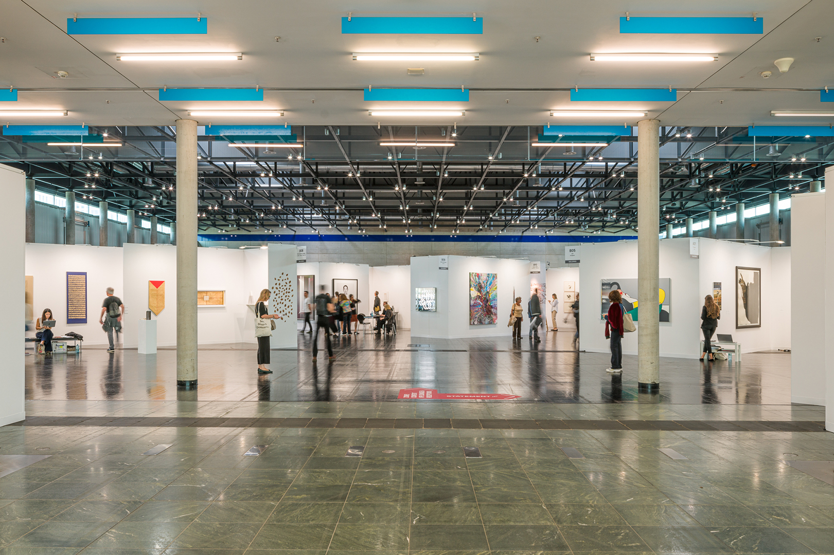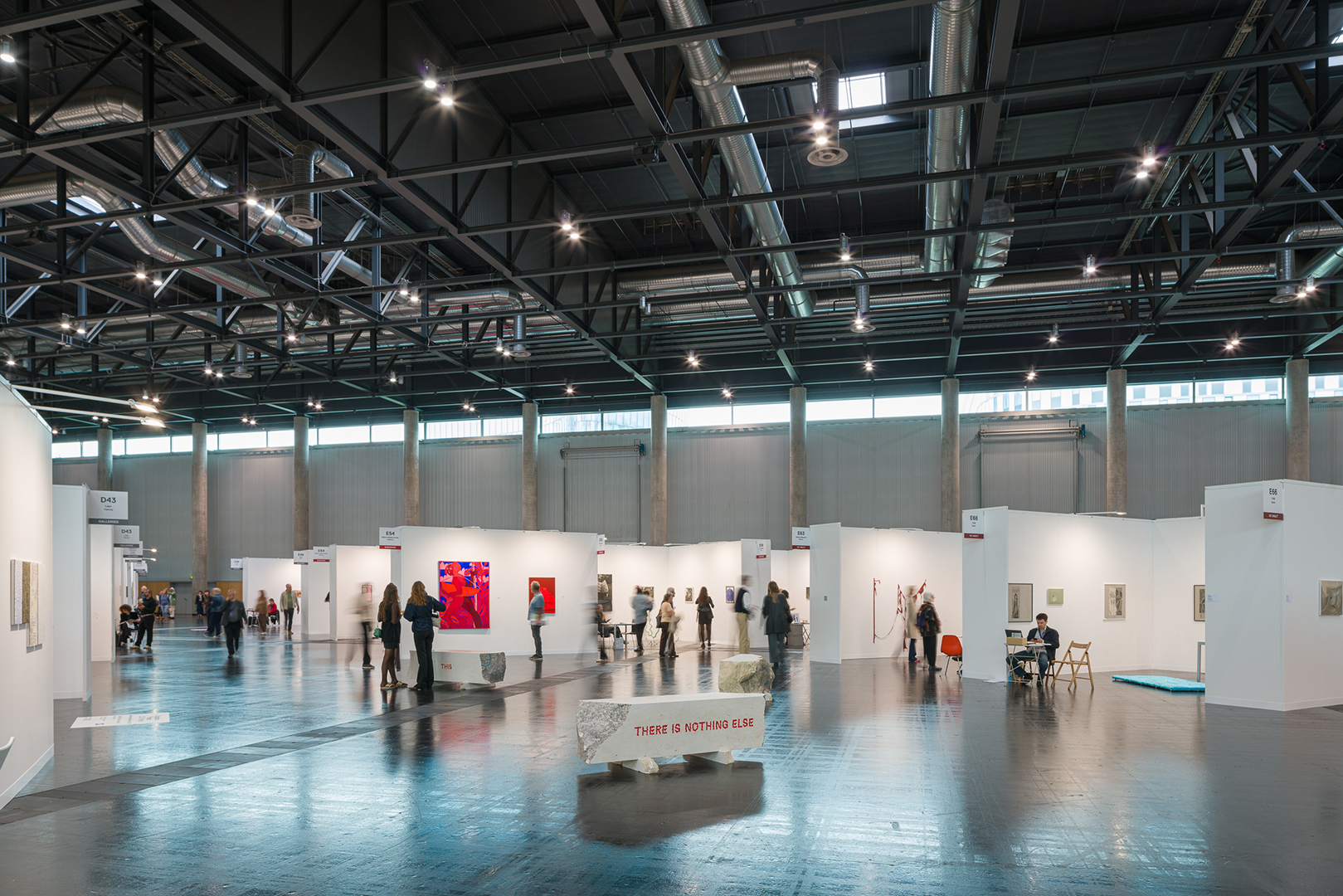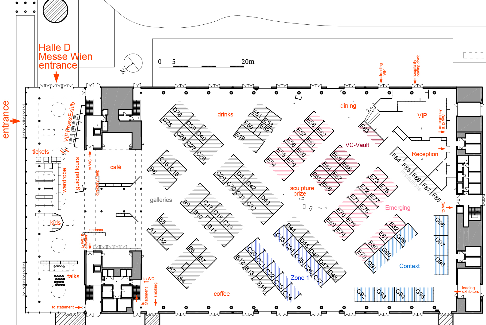 Layout für die Kunstmesse Vienna Contemporary. Die Gestaltung beschränkte sich auf die Anordnung und Gliederung der Blöcke, deren Verhältnis zueinander und zur Hülle. Die Ausrichtung der Erschliessung ist 45 Grad zur Aussenhülle angeordnet, durchgehend in die eine Richtung, versetzt in die andere.
