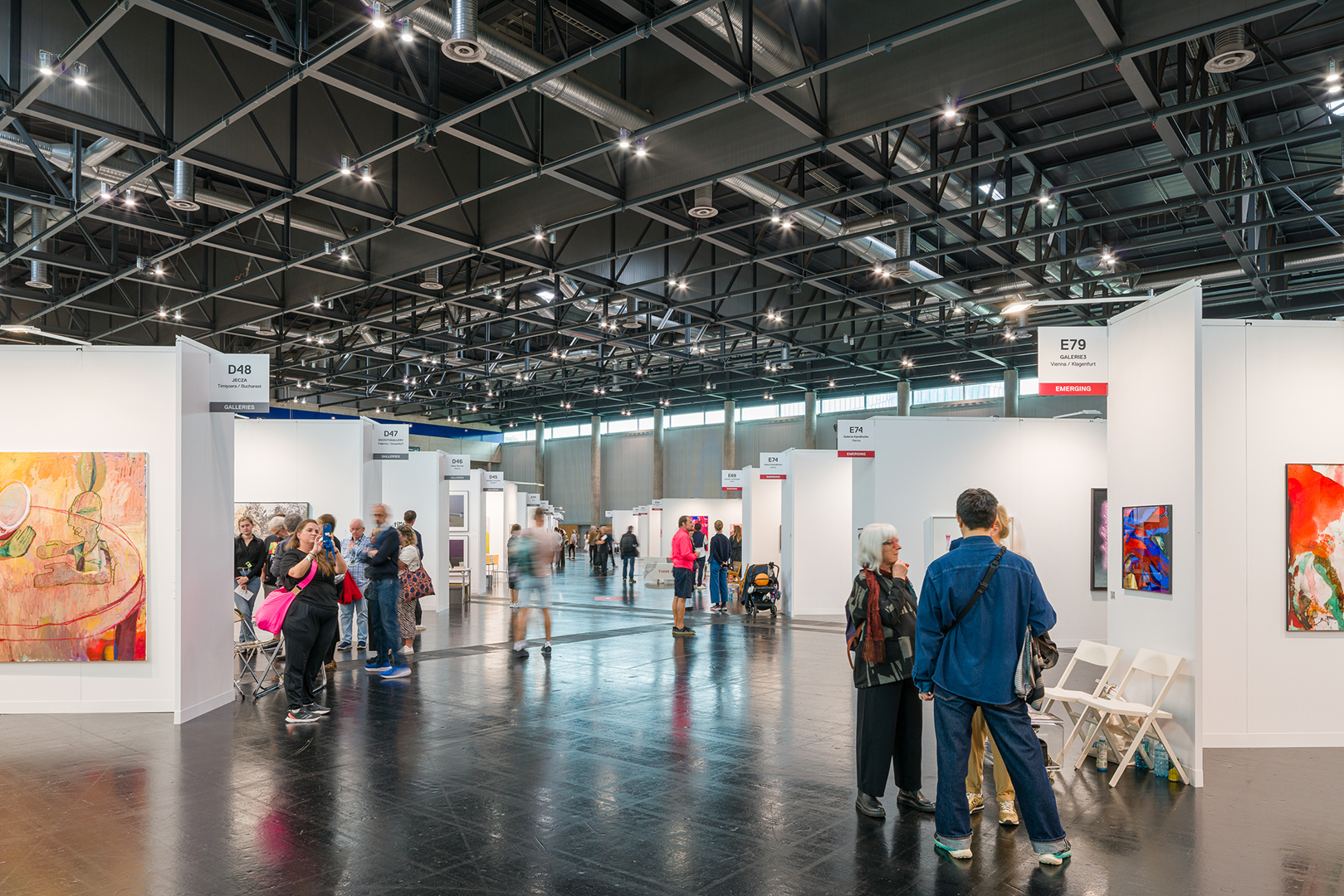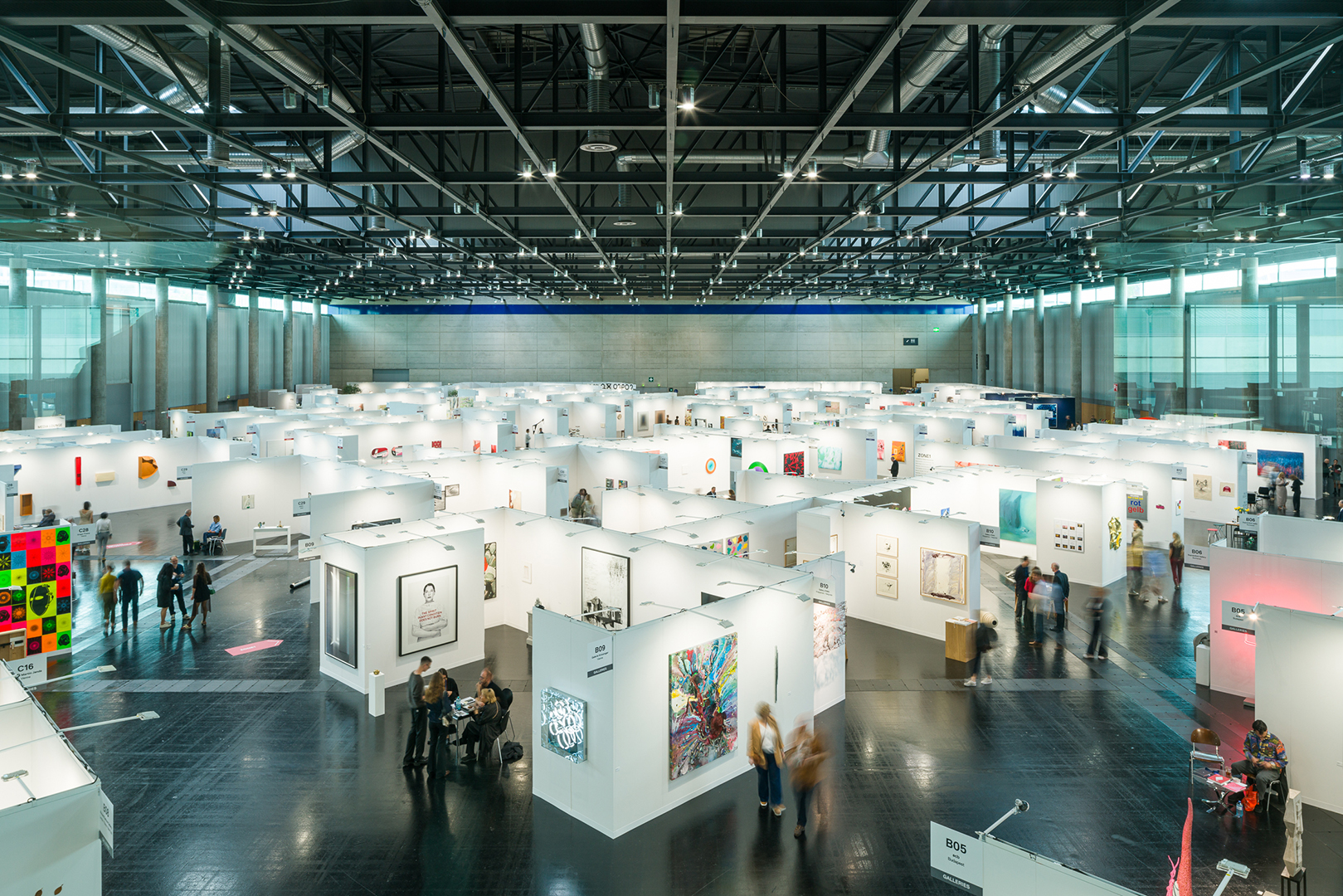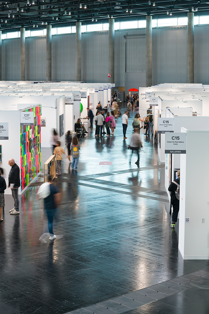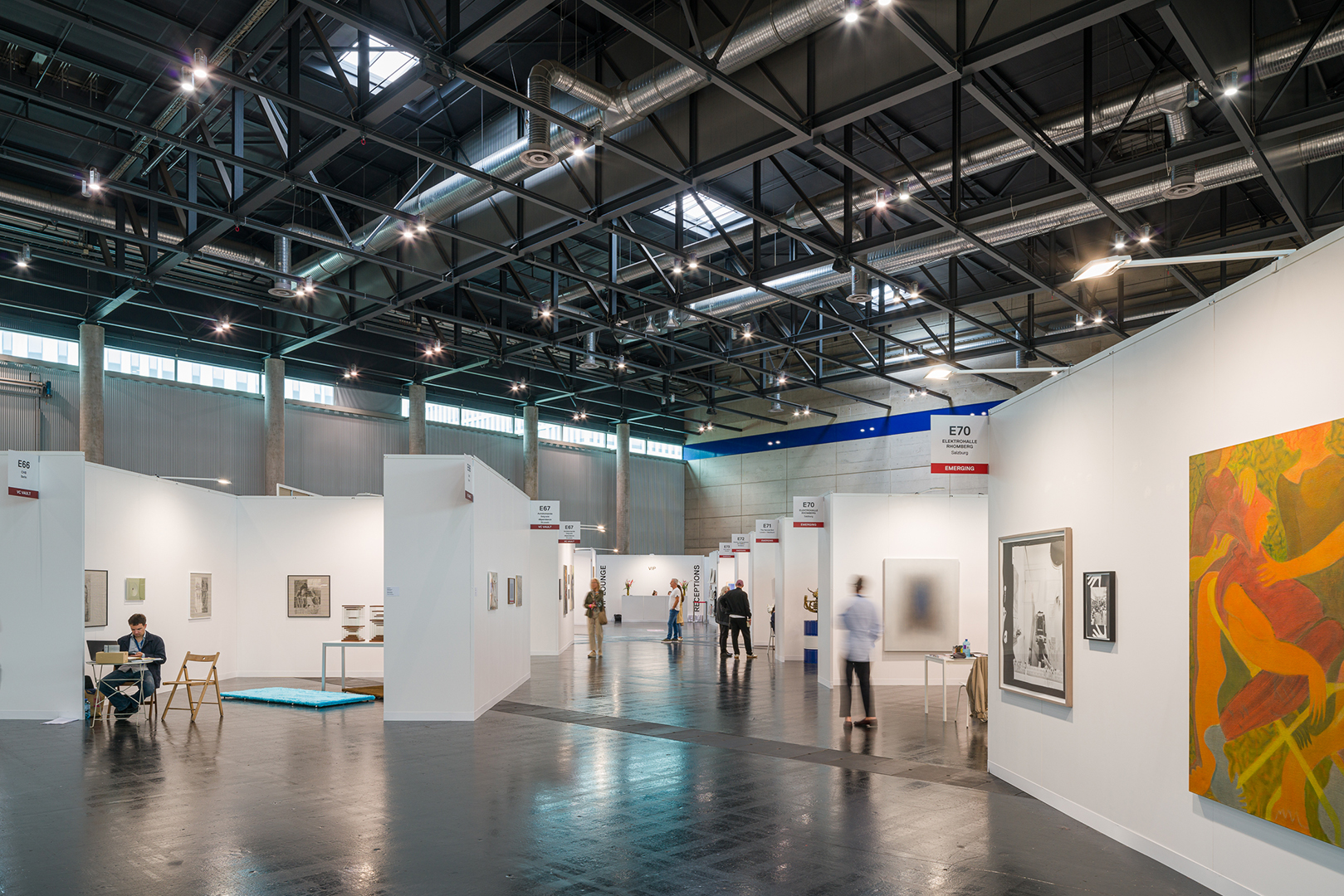 Layout für die Kunstmesse Vienna Contemporary. Die Gestaltung beschränkte sich auf die Anordnung und Gliederung der Blöcke, deren Verhältnis zueinander und zur Hülle. Die Ausrichtung der Erschliessung ist 45 Grad zur Aussenhülle angeordnet, durchgehend in die eine Richtung, versetzt in die andere.